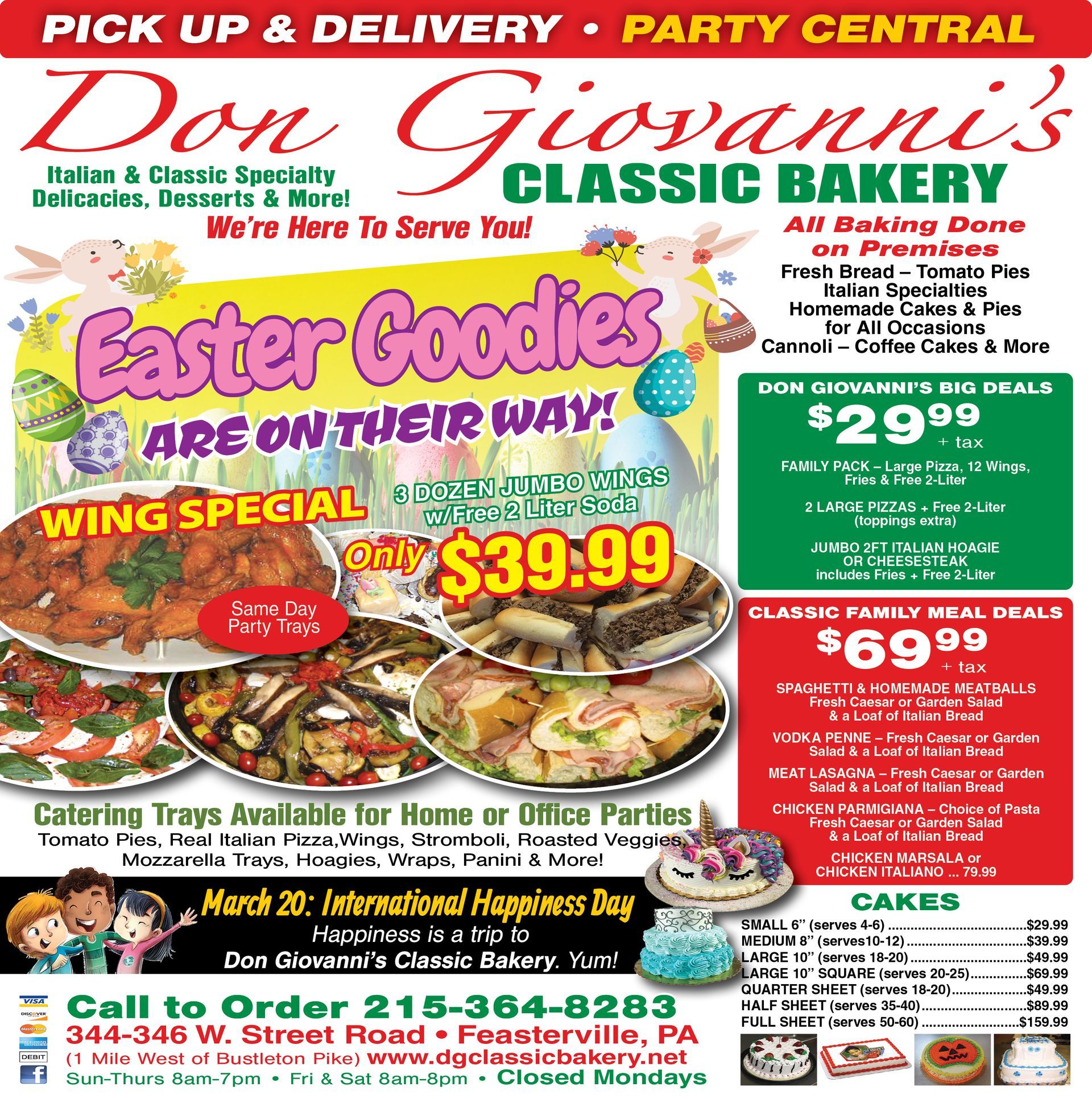 Don Giovanni's is more than just a traditional Bakery. Once you step inside you'll find all the sights and aromas of a delicious goodie smorgasbord! Everything at the Bakery is always fresh and made to order. So if you need something delicious for a party of 1 or 101, you can find that here...We offer take-out, all day delivery, catering, daily specials, and much more