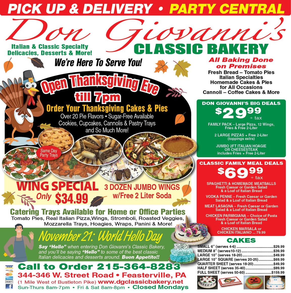 Don Giovanni's is more than just a traditional Bakery. Once you step inside you'll find all the sights and aromas of a delicious goodie smorgasbord! Everything at the Bakery is always fresh and made to order. So if you need something delicious for a party of 1 or 101, you can find that here...We offer take-out, all day delivery, catering, daily specials, and much more
