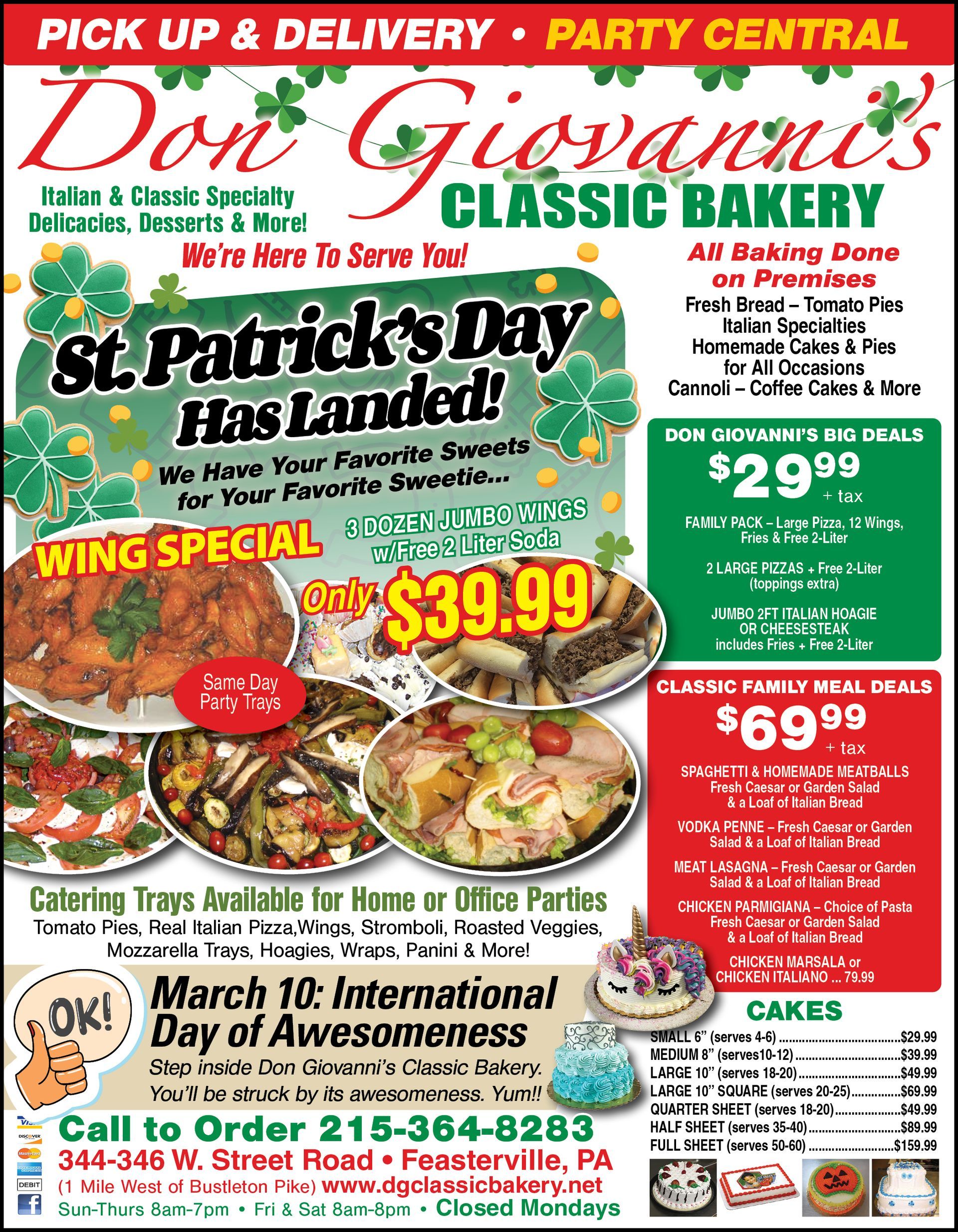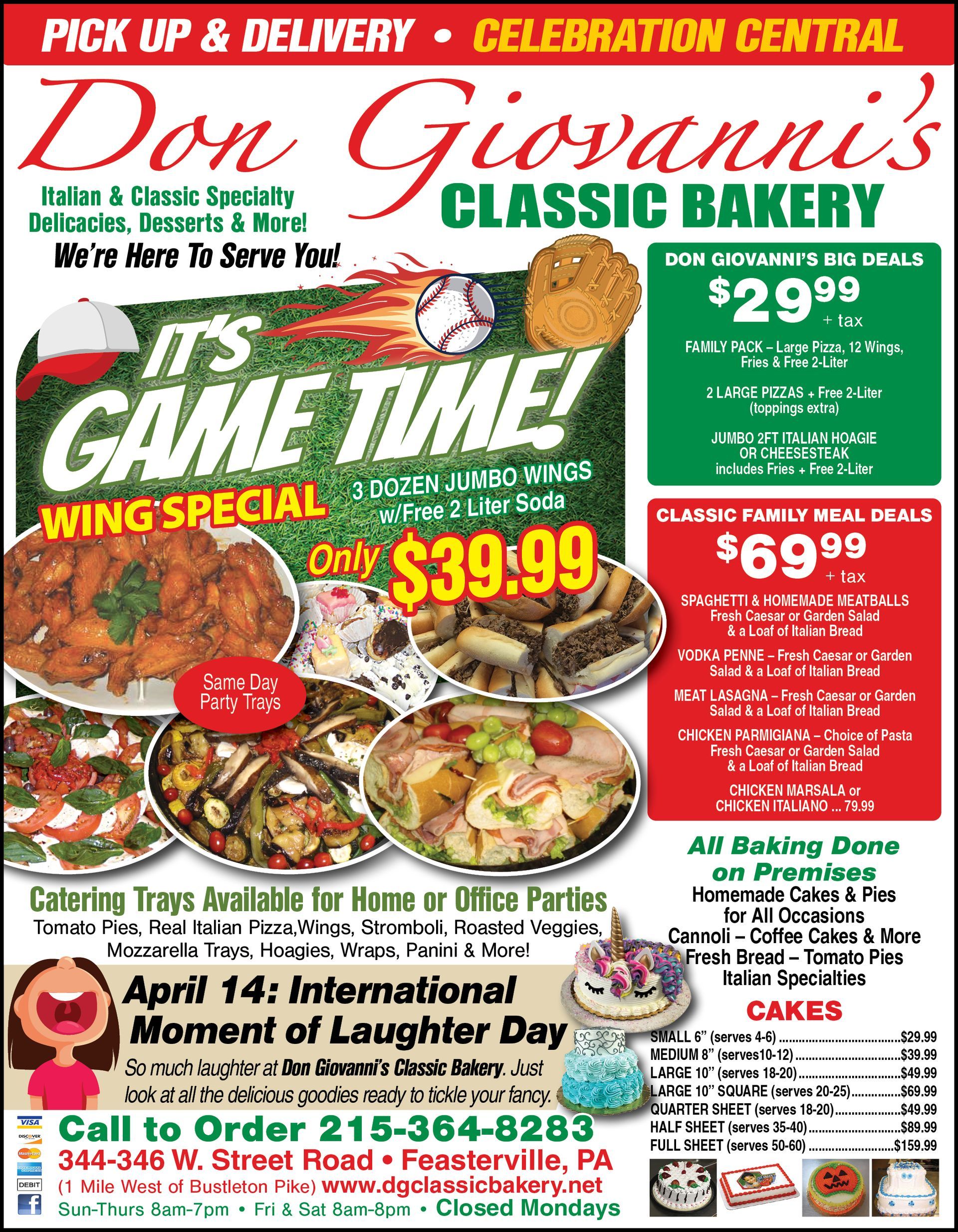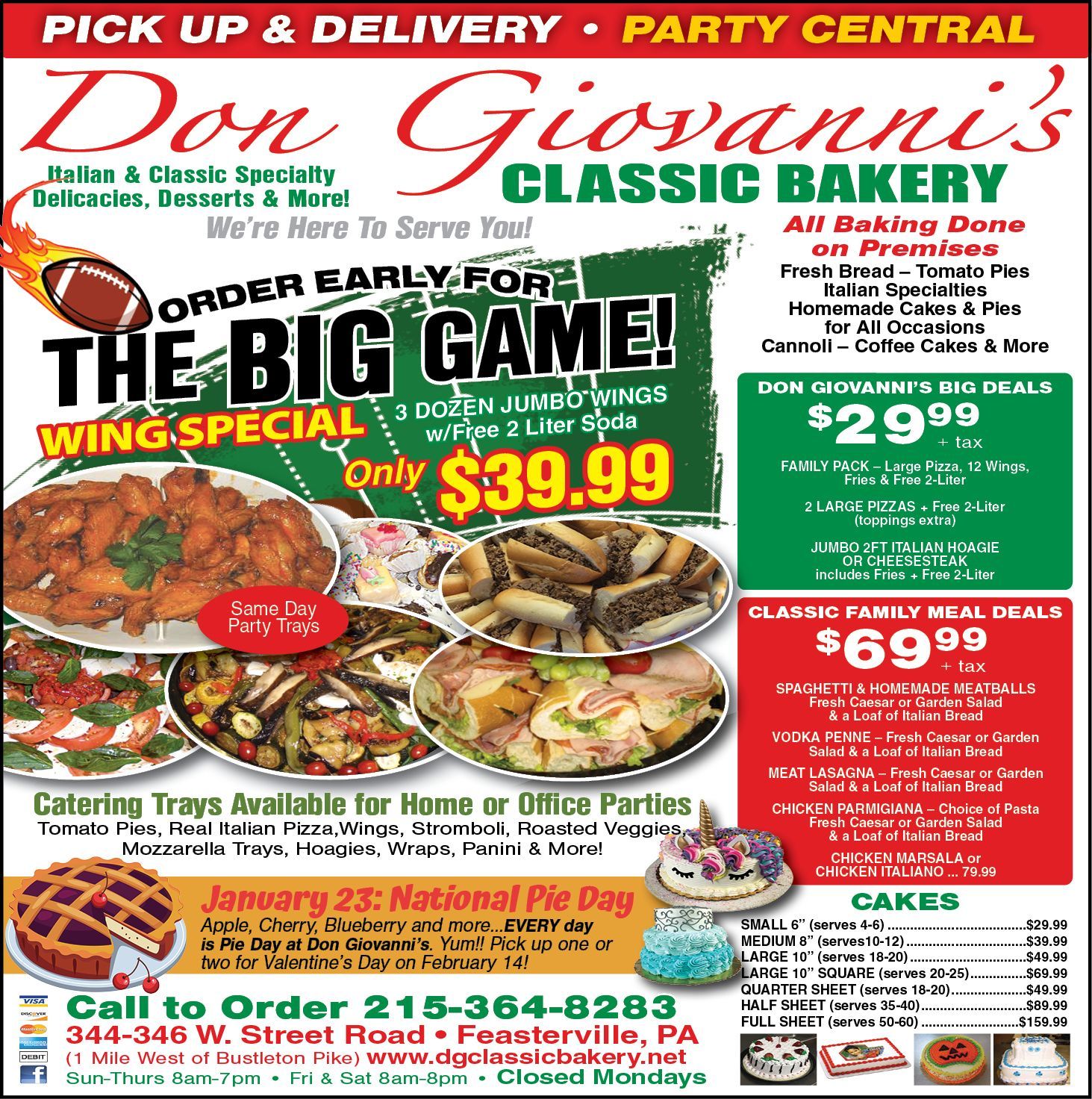 Don Giovanni's is more than just a traditional Bakery. Once you step inside you'll find all the sights and aromas of a delicious goodie smorgasbord! Everything at the Bakery is always fresh and made to order. So if you need something delicious for a party of 1 or 101, you can find that here...We offer take-out, all day delivery, catering, daily specials, and much more